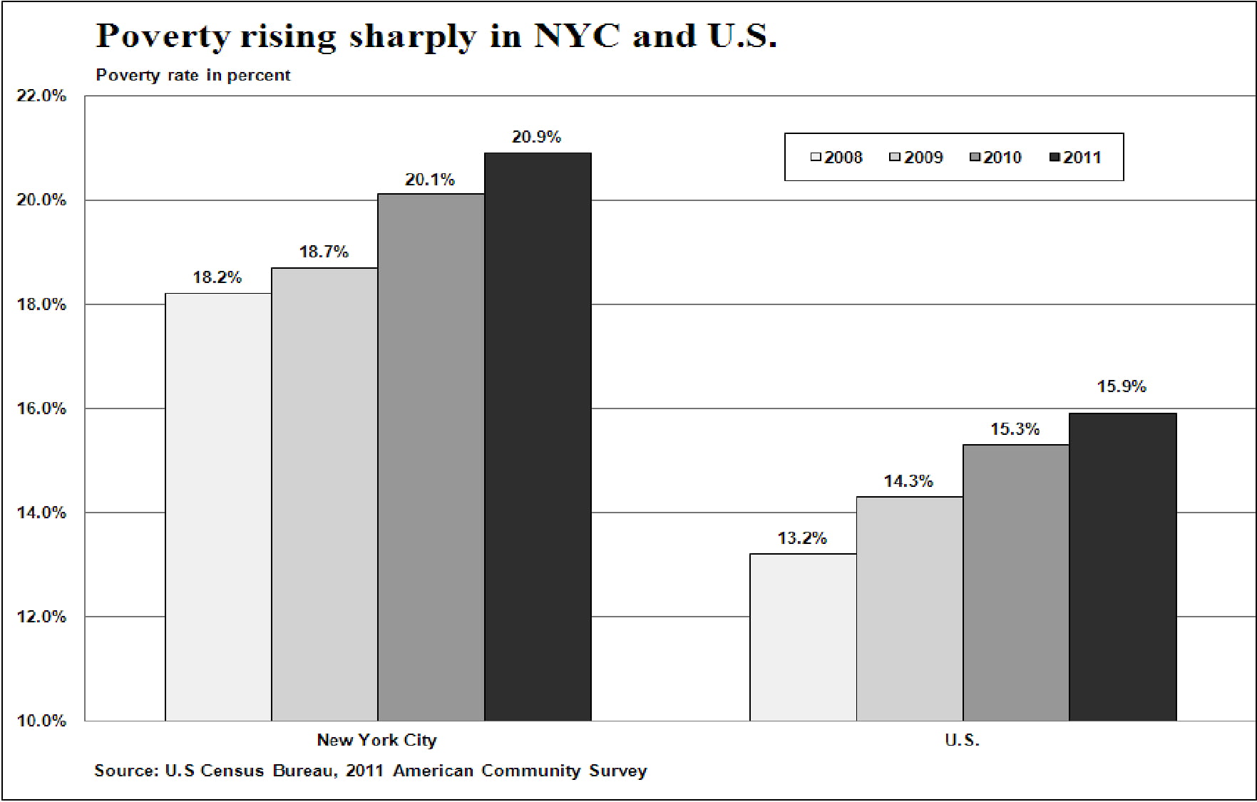 Poverty has increased and incomes have fallen each year since 2008. NYC’s poverty rate climbed from 18.2% in 2008 to 20.9% in 2011, an increase of 2.7 percentage points, the same as for the nation as a whole (the U.S. poverty rate went from 13.2% to 15.9% over this 3-year period).