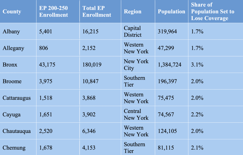 Table 2 presents EP coverage loss by county. A similar pattern emerges, with coverage losses distributed throughout the state. Notably, New York County (Manhattan) is among the least-impacted counties in the State, while Fulton and Suffolk are among the most impacted; in Suffolk County alone, 38,000 people are set to lose insurance this July.